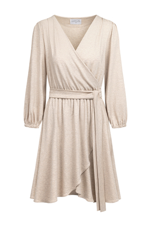 Scarlet Mini - Rozkloszowana sukienka kopertowa w kolorze piaskowym