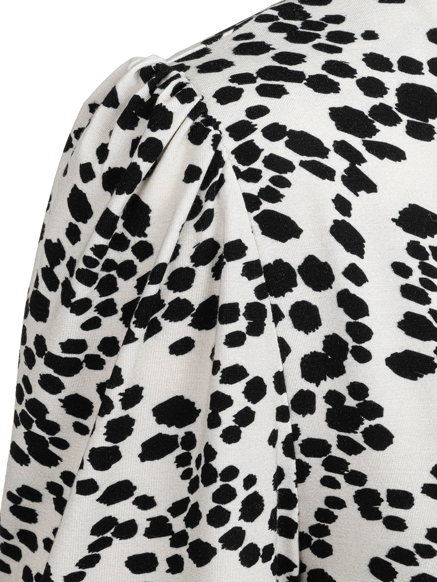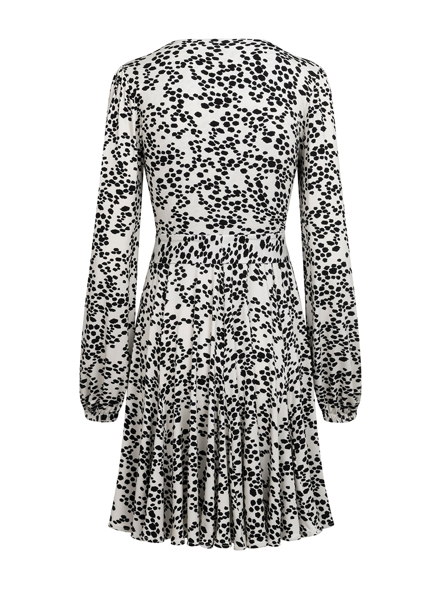 • Rozkloszowana sukienka z godetami, kopertowym dekoltem i luźnymi długimi rękawami. Sukienka bez kieszeni z dodatkowym osobnym paskiem. Uszyta z wiskozy premium drukowanej cyfrowo w autorski wzór Cruella en Chic.